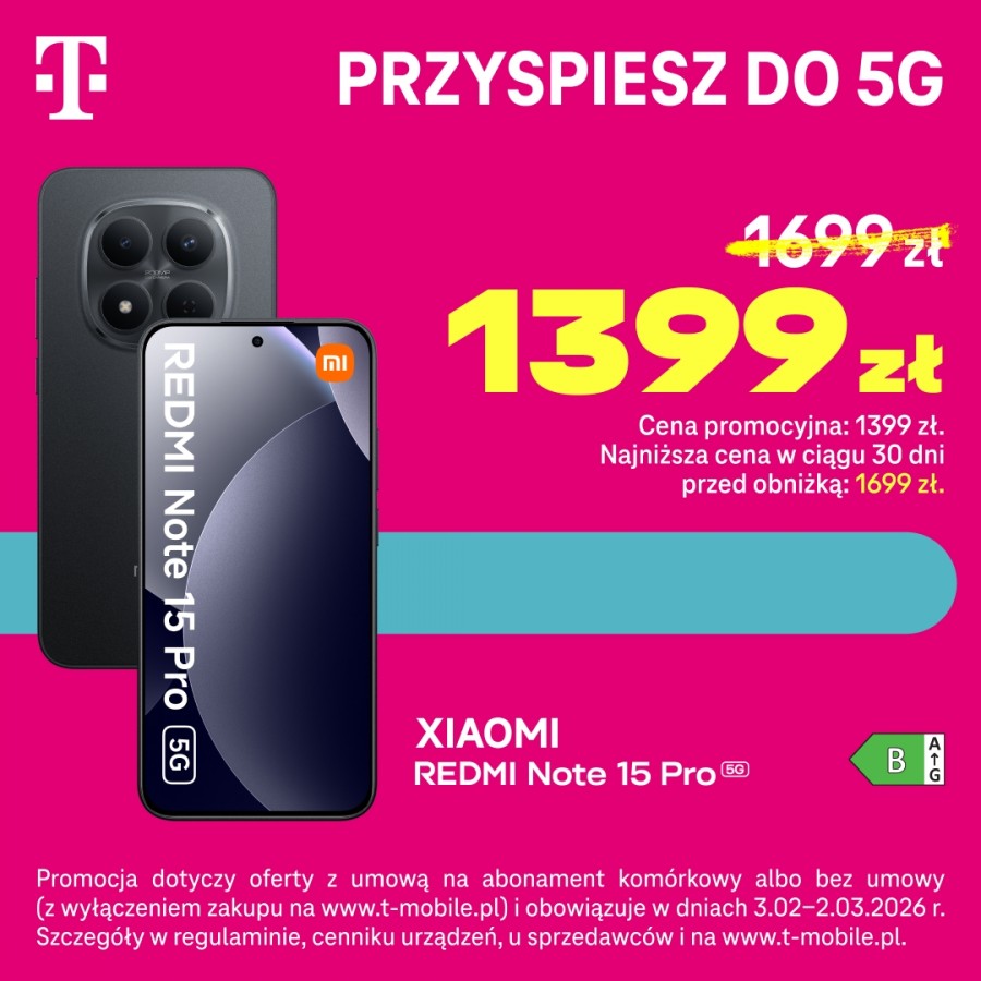 Teraz XIAOMI REDMI Note 15 Pro 5G w cenie 1.399 zł. Promocja dotyczy oferty z umową na abonament komórkowy albo bez umowy (z wyłączeniem zakupu na www.t-mobile.pl) i obowiązuje w dniach 3.02 -2.03.2026r. Szczegóły w regulaminie, cenniku urządzeń, u sprzedawców i na www.t-mobile.pl.