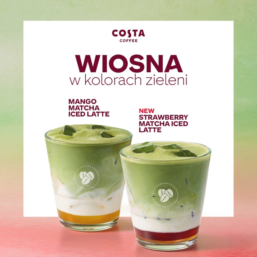 Wiosna w Costa Coffee zagościła na dobre! Spróbuj nowej Strawberry Matcha Iced Latte, która łączy japońską matchę z napojem kokosowo-sojowym Alpro i owocowym purée Lekko, świeżo i totalnie w trendzie! A dla fanów egzotyki – Mango Matcha Iced Latte Idealne orzeźwienie na wiosenne dni